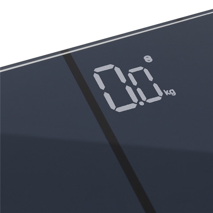 - Functional si usor de utilizat, datorita afisajului LED si a designului usor si plat. Intr-un stil modern si futurist, este confectionat din materiale ultra-rezistente, cum ar fi sticla securizata, suporta o greutate de pana la 180 kg.